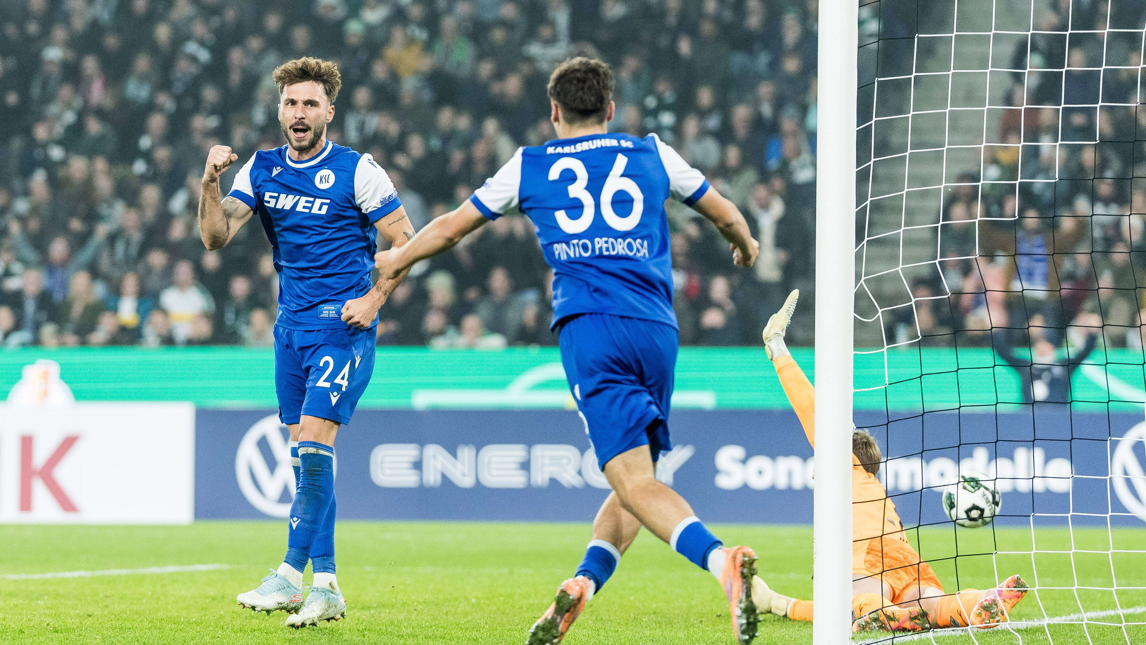 Doch die Antwort sollte nicht lange auf sich warten, denn nur vier Minuten später stellten die Gäste den alten Abstand wieder her - Doppelpack Schleusener. Und dann kam der Stein plötzlich so richtig ins Rollen! Der KSC spielte sich in einen Rausch und stellte nach einer knappen halben Stunde durch einen granatenmäßigen Linksschuss von "Schleuse" auf 1:3. Gladbachs Gegenwehr war plötzlich gebrochen und den Fächerstädter sollte einfach alles gelingen. So legte der Toptorjäger noch drei Buden im ersten Abschnitt nach.