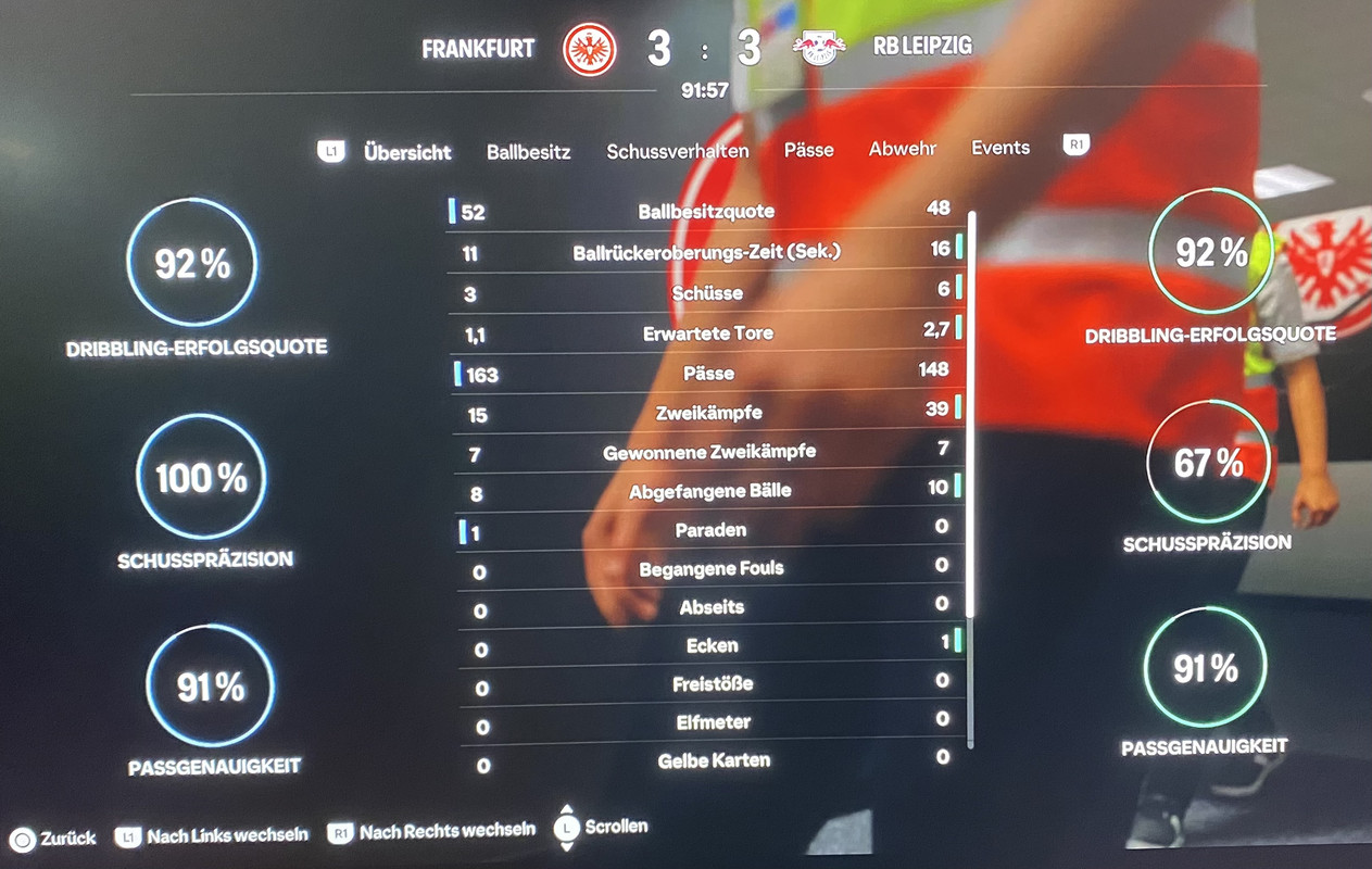 Im zweiten Durchgang kamen die roten Bullen dann deutlich besser raus und erzielten verdientermaßen das 3:3 durch Sesko. Frankfurt hatte im zweiten Spielabschnitt keinen einzigen Torschuss mehr zu verzeichnen, konzentrierte sich auf Ballbesitz in für uns ungefährlichen Zonen. Einmal Sesko nach Querpass von Openda und Lois selber hätten das Spiel gänzlich drehen können/müssen, doch es blieb am Ende beim Remis. Etwas ärgerlich, war auswärts in Hessen doch etwas mehr drin. Die SGE wiederum besticht durch brutale Effizienz.